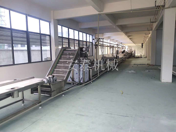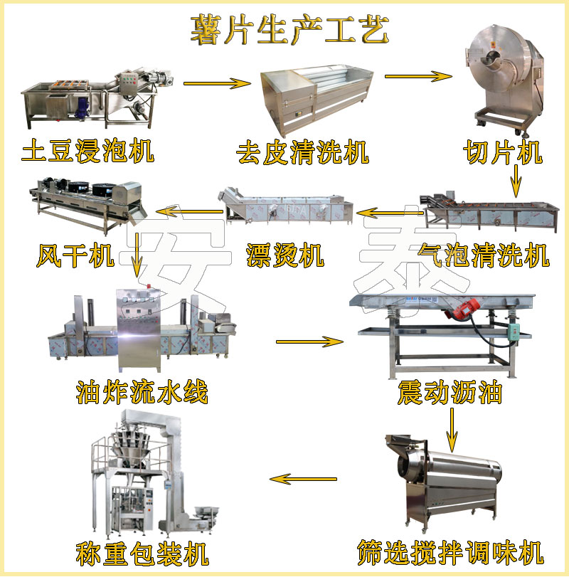 薯片工藝流程:土豆浸泡機(jī) —— 上料提升機(jī)—— 清洗去皮機(jī) —— 挑揀線 —— 提升機(jī) —— 切片機(jī) —— 漂洗線 —— 風(fēng)冷瀝水機(jī) —— 油炸線 —— 振動瀝油機(jī) —— 調(diào)味拌料機(jī)—— 稱重包裝機(jī)